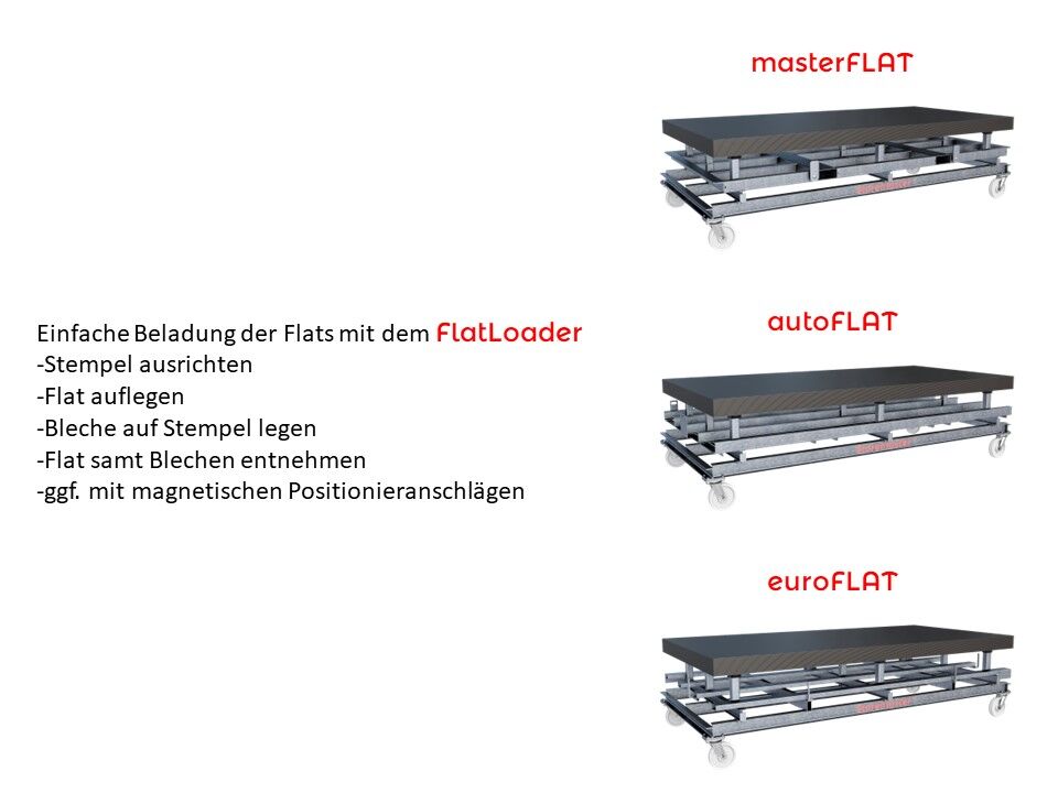 es el storemaster® - Solución para la carga patentada de palés de sistema (casetes de almacenamiento de chapas) con paquetes de chapas enteros. Los émbolos móviles permiten una adaptación especialmente rápida a la cubicación respectiva de los formatos de pila de chapas. Los grandes discos de goma dura de Ø 75 x 25 mm fijados a los émbolos de elevación evitan las marcas de presión y la deformación de las chapas. La hoja superior puede retirarse libremente por todos los lados de los paquetes de hojas estampadas, lo que supone una ventaja ergonómica. La FlatLoader está completamente galvanizada en caliente conforme a la norma DIN EN ISO 1461, lo que la hace adecuada para su funcionamiento y almacenamiento a largo plazo en el exterior. Capacidad de carga estática de la FlatLoader con 4.000 kg. O bien con 4 ruedas de poliamida para cargas pesadas que incluyen frenos de palanca de pie para permitir la maniobrabilidad bajo carga, o bien como versión fija. La carretilla elevadora puede FlatLoader en cualquier lugar - incluso en storemaster® Sistema de estantes: almacenamiento cómodo y que ahorra espacio.