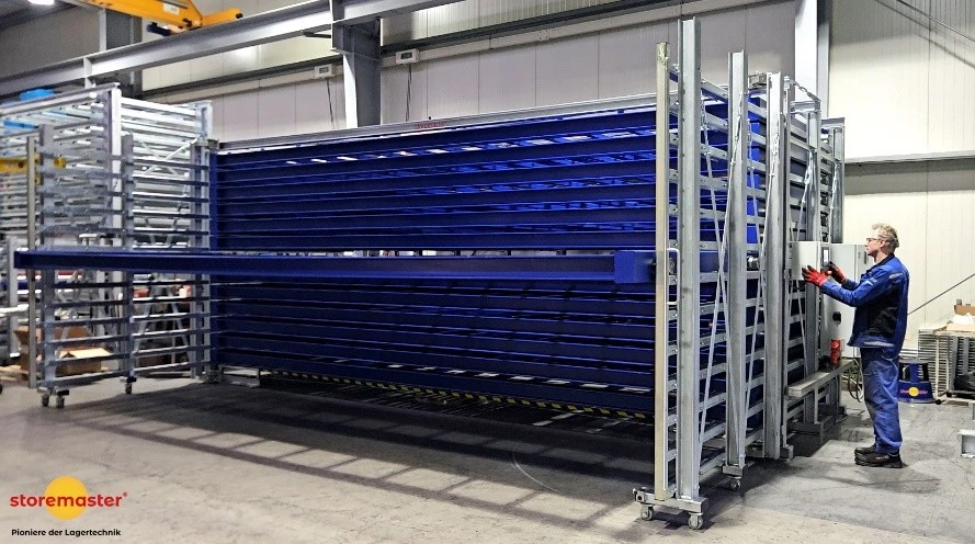 - Stockage confortable des paquets plutôt que tôle par tôle avec le dépalettiseur breveté PalEx, grâce à la storemaster® LE SYSTÈME Construction du cadre de l'entretoise profonde du tiroir (invention de 1995) avec encastrement du paquet de tôles résistant au déplacement.