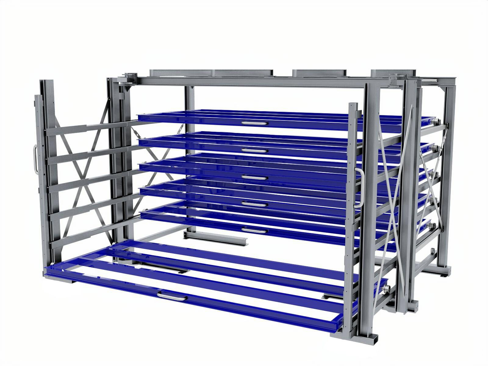 回転式引き出しローラー式サイドパネル付き板金収納引き出しシステム、オプションでロック可能、頑丈な永久潤滑ブロックヒンジが回転式パネルを高さ位置に固定、永久的に溶接された段差のないブロックレールと回転レールの間のレール移行部 - ネジがなく storemaster - ミットルトランジション国際規格に準拠した労働安全性、ブロック組み立て式ですぐに使用できます。 - オプト電動引出し。自動ロック装置により、手動操作なしで引出しのレストポジションと作業ポジションが固定され、可搬重量2,000kg以下の引出しにはメカニカルロック、サーボ特許取得のスラストスプリングにより、可搬重量2,500kg以上のヘビーデューティ引出しの拡張が容易。 床に接触しない引き出し式ランナーウォール どのような床の状態にも対応します。