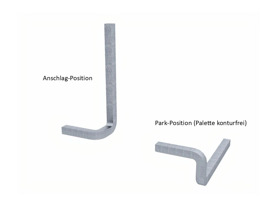 6 Stück je Ladungsträger als längs- und stirnseitige, innerbetriebliche Transport-Sicherung; in Park-Position störkonturen-frei verdeckt. Preis je euroFLAT.
